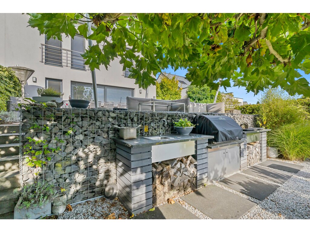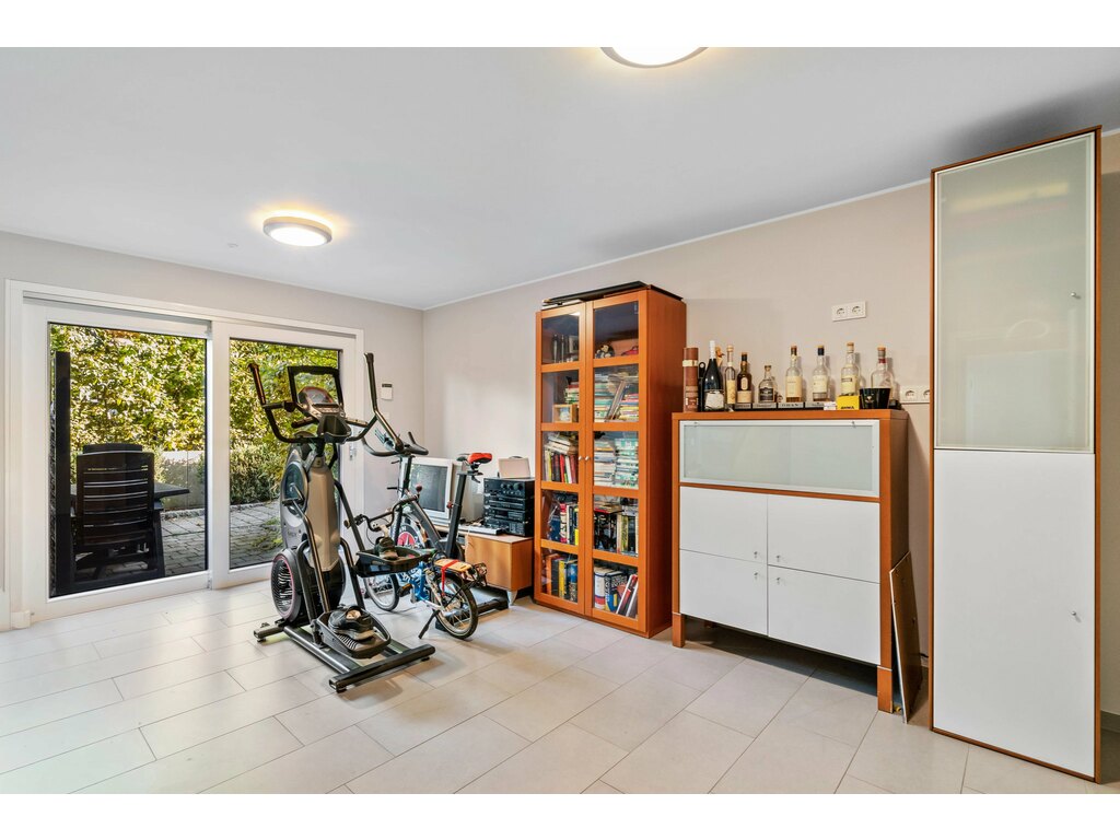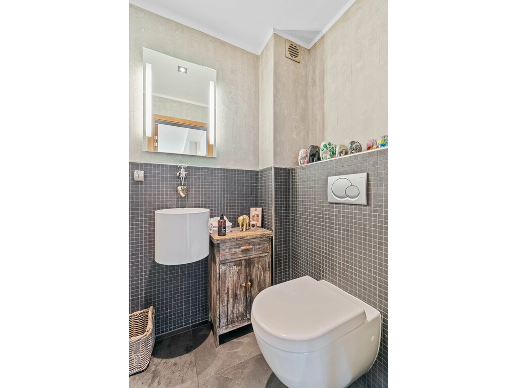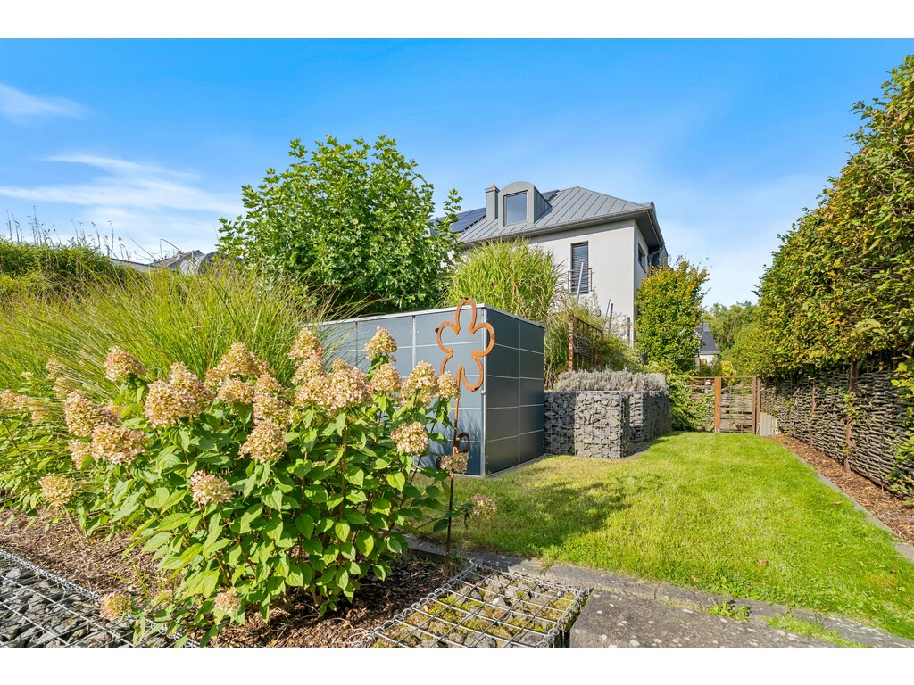 L’extérieur, parfaitement entretenu, offre une terrasse de ± 40 m² équipée d’un voilage, une cuisine d’été, un abri de jardin, et un jardin entièrement clôturé.