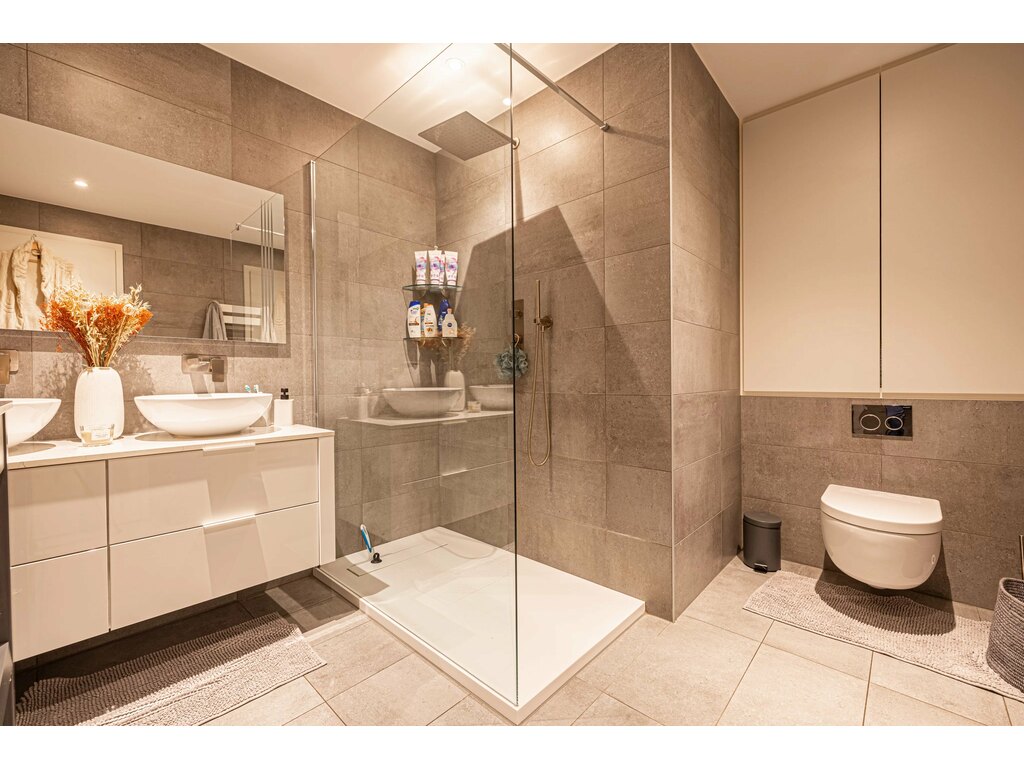 - Salle de douche avec double lavabo et toilette