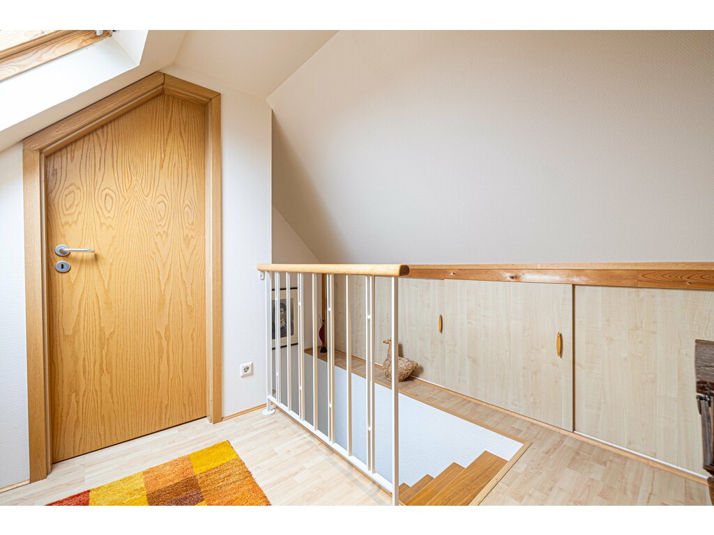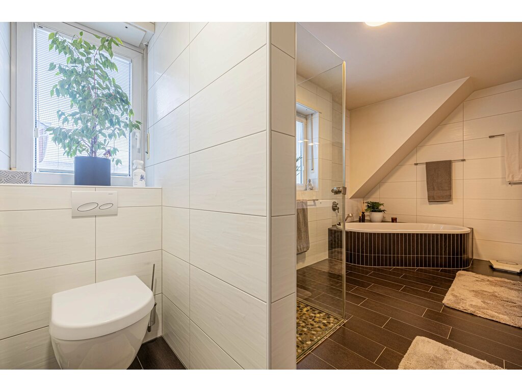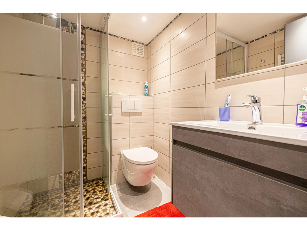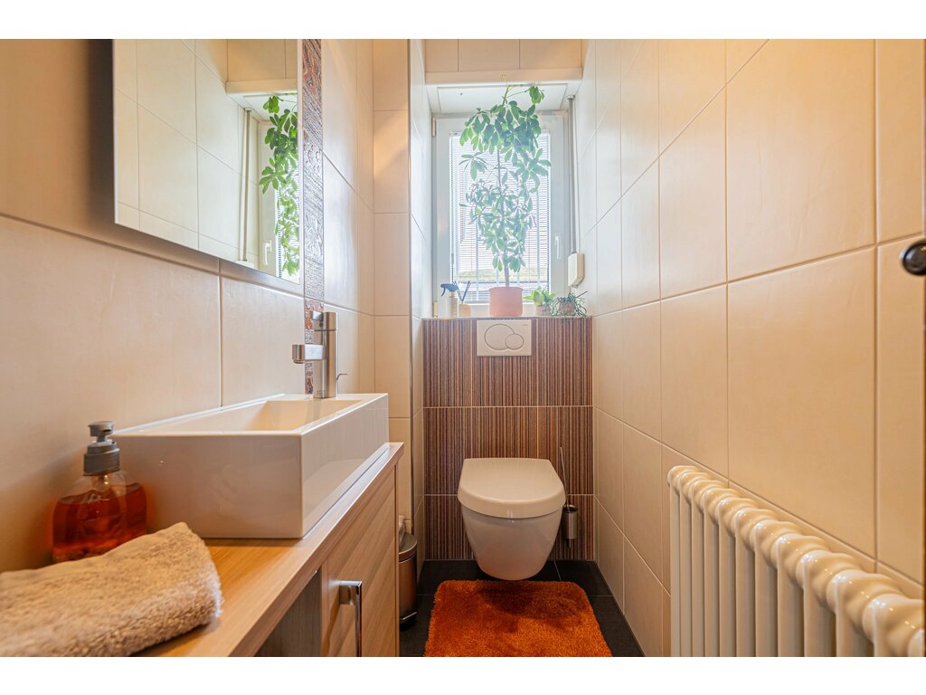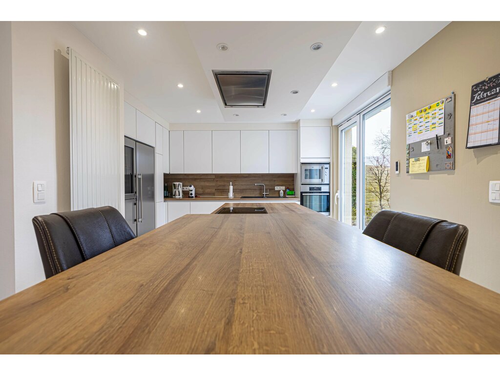 La cuisine séparée, conviviale, dispose d’un coin salle à manger et d’un accès direct à la terrasse et au jardin, parfait pour les beaux jours. Un WC séparé complète ce niveau.