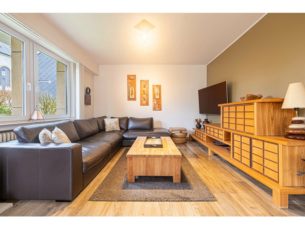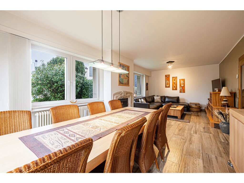 Le vaste salon avec salle à manger offre un espace de vie élégant et lumineux, idéal pour recevoir.