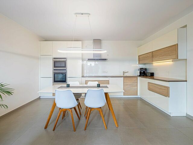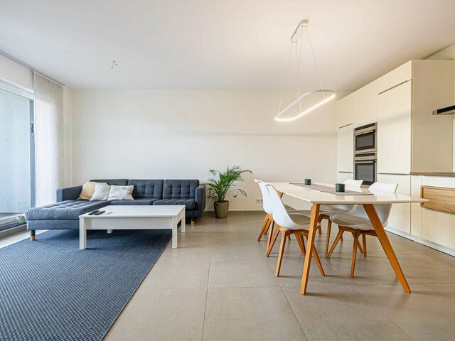 L’espace de vie propose un séjour ouvert sur la salle à manger et la cuisine, créant une atmosphère conviviale et lumineuse, avec accès direct à une terrasse offrant une vue dégagée.