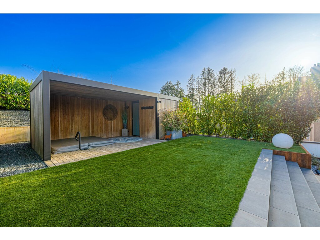 - Jardin aménagé avec jacuzzi encastré et cabane de jardin