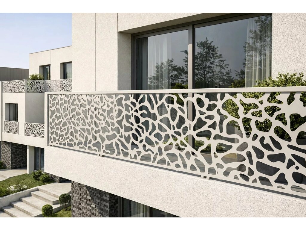 • Détails d'exception avec garde-corps en acier au design personnalisé et menuiseries mixtes ALU/BOIS à haute performance énergétique.