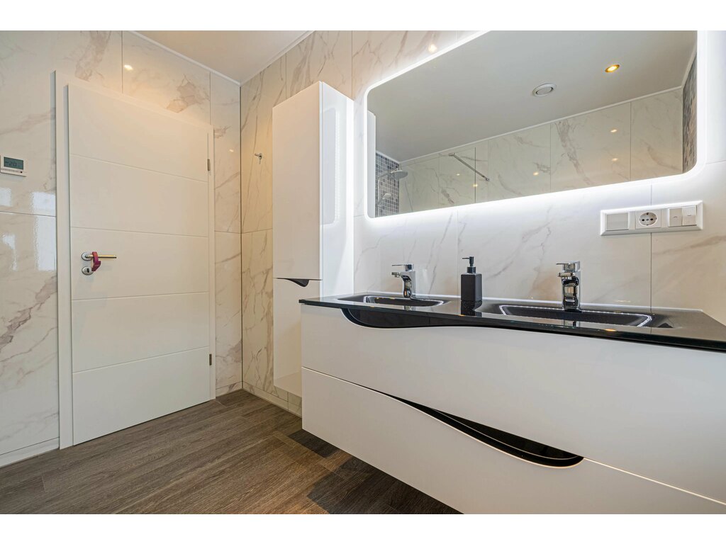 • Salle de douche avec finitions soignées, Wc, double vasque et fenêtre